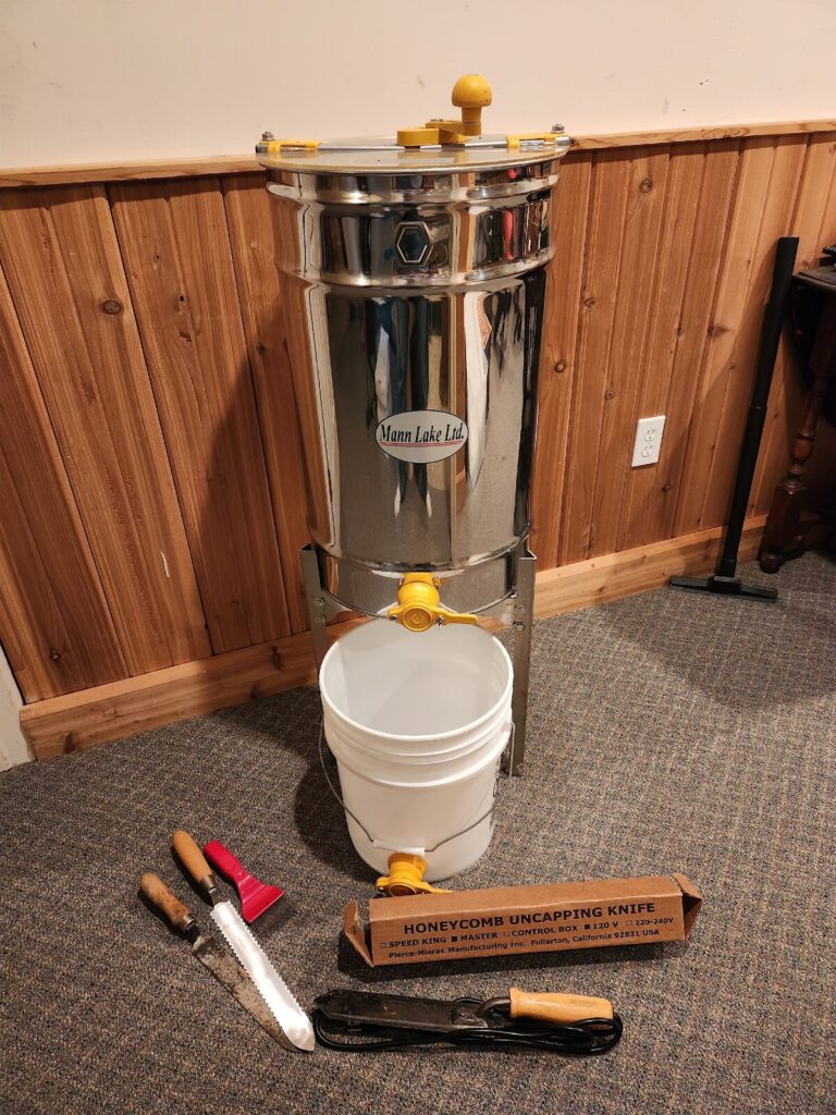 Includes a 3-frame Mann Lake stainless steel, hand cranked honey frame extractor, one stainless steel extractor stand, two stainless steel sieves, two cold decapping knives, one electric hot knife, and one food grade honey bucket with a gate.